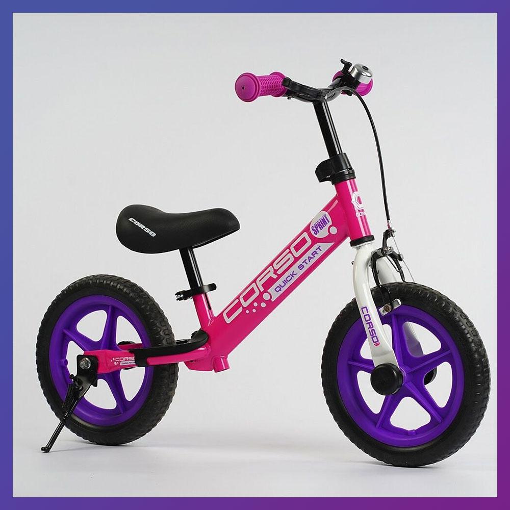 Дитячий біговел велобіг на сталевій рамі 12 дюймів Corso 74822 EVA колеса з ручним гальмом підніжка рожевий